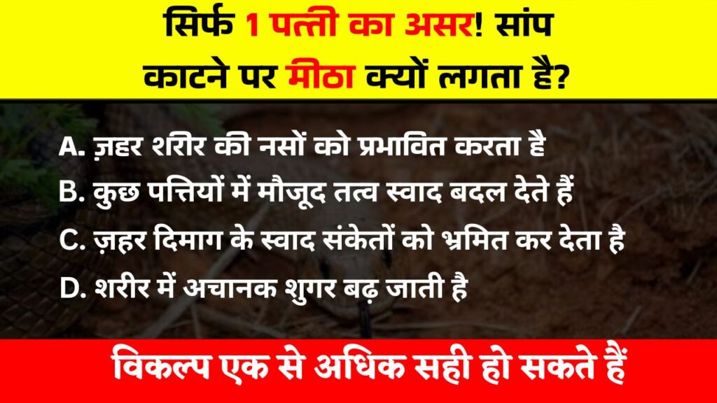 Interesting GK Quiz in Hindi – सांप के काटने से जुड़ी कई कहानियां, मान्यताएं और सवाल सदियों से लोगों के मन में मौजूद हैं। इन्हीं में से एक बेहद रोचक सवाल है कि सांप काटने के बाद कई लोगों को मुंह में अचानक मीठा स्वाद क्यों महसूस होता है। यह बात सुनने में अजीब जरूर लगती है, लेकिन इसके पीछे विज्ञान और शरीर की जैविक प्रतिक्रियाओं का बड़ा कारण छिपा है। कई बार ग्रामीण इलाकों में यह भी कहा जाता है कि किसी खास पत्ती या जड़ी-बूटी के सेवन से यह मीठा स्वाद और ज्यादा महसूस होता है। ऐसे सवाल अक्सर GK क्विज़ में पूछे जाते हैं, क्योंकि इनमें विज्ञान, स्वास्थ्य और सामान्य ज्ञान का अनोखा मेल होता है।